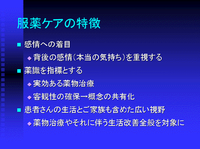 それでは、服薬ケアとはどんな特徴を持っているのでしょうか。ここでは薬剤師が患者さんの薬識形成に関わることによって、Patient Orientedな薬物治療を成功に導くことが期待できるという今回の論点に沿って、その特徴を振り返ってみることにします。