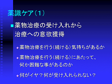 すでに述べたように、薬物治療を医師から指示されたあと、患者さんが「薬物治療を行う」ということに関して、どの程度受け入れ、どの程度意欲を持ってその治療に取り組むかが、薬物治療成功の大きなポイントになって来ます。そこに何か受け入れ困難なはっきりした理由があることもあれば、これから自分が薬を飲まなければいけないという事実を素直に受け入れることができなかったり、服薬に関して漠然とした不安を抱えていることもあって、患者さんの薬識は様々です。