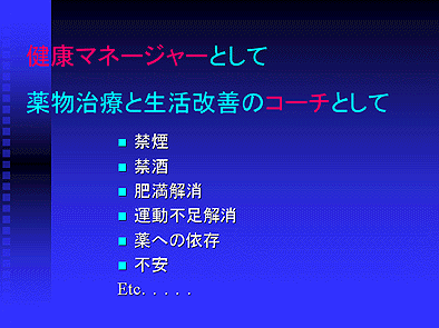 生活改善を成功させるには、マネジメントの考え方やコーチングの考え方を取り入れると、より効果的に患者さんのQOL向上へ寄与できると考えています。お酒、タバコ、運動不足、肥満など、あるいは薬への依存や不安を解消または軽減するためには、単に注意したりその危険性を説明するだけでなく、患者さんの気持ちに寄り添いながら本人にその意義を理解してもらい、本人がその気になって取り組んでもらうように導く必要があるのです。これはまさにマネジメントであり、コーチングの技法が活用できる場面であると言えるでしょう。患者さん本人が自らその意義を認め、しっかりとした意識を持って生活改善や薬物治療の継続に取り組めるように、コーチングの考え方を取り入れたアプローチが有効であると考えています。