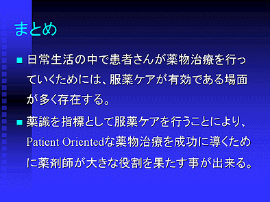 日常生活の中で薬物治療を行っていく外来患者さんの場合、服薬ケアの考え方が非常に有効である場面が多く存在します。そして薬識を指標として患者さんの薬識を目指したケアを行っていくことにより、患者さんのニーズにきめ細かく対応したケアが可能になってきます。それによって薬剤師はPatient Orientedな薬物治療成功のために大きな役割を果たすことができるのです。