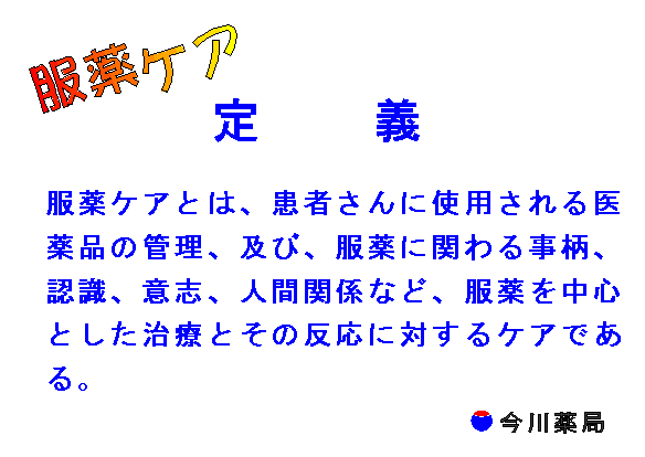 「服薬ケアとは、患者さんに使用される医薬品の管理、及び、服薬に関わる事柄、認識、意志、人間関係など、服薬を中心とした 治療とその反応に対するケアである。」と定義してみました。