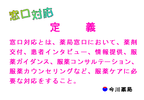 「窓口対応とは、薬局窓口において、薬剤交付、患者インタビュー、情報提供、服薬ガイダンス、服薬コンサルテーション、服薬カウンセリングなど、服薬ケアに必要な対応をすること。」と定義します。