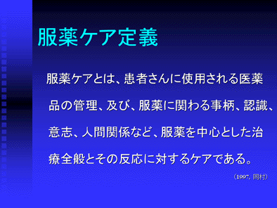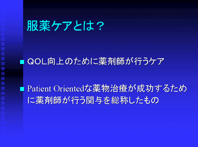服薬ケアとは、薬物治療を行う患者さんのQOL向上のために、薬剤師が行うケアを言います。そしてそれはPatient Orientedな薬物治療が成功するために薬剤師が行う関与をすべて総称したものと言えると思います。