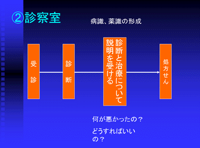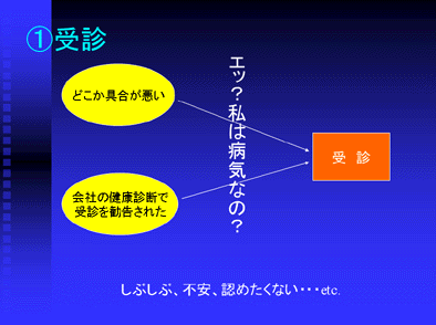 患者さんが最初に受信するきっかけは様々です。その時の患者さんの心理状態を考えてみると、自分が病気であることを認めたくなかったり、あるいは気が進まなくてしぶしぶの受診であったり、また「病気である」ということに対する不安などを抱えているというように、本当に多くの不安や抵抗感を持っていらっしゃるはずです。そしてその様な心理状態の中で、最初の薬識形成のきっかけである医師からの説明を受けることになるのです。