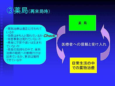 患者さんが日常生活において薬物治療を続けていくにあたっては、薬を受け取りに薬局を何度も訪れることになります。この時もやはり薬学的なチェックが必要なことは言うまでもないことですが、それにも増して患者さんの心の中で不安や迷いが生まれていないか、薬物治療への意欲は持続できているかなどの薬識のチェックがとても重要になってきます。なぜならば日常生活の中で行われる薬物治療は、生活上でのあらゆる心の動きに影響を受け、薬識が大いに揺らぐのが普通だからです。