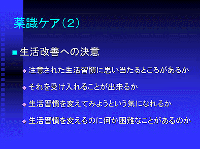 もう一つの大きなポイントである生活改善への決意にあたっては、注意された生活習慣に思い当たるところがあるかどうか、あるいはそれを受け入れ生活を変えてみようという気持ちになれるかどうか、などの心の動きをケアしていく事により、患者さんの自己決定による行動変容を促すことが可能になってきます。服薬ケアではこの点についても重視しており、薬を飲みながら送る日常生活の中で、少しでも生活習慣を改善し、QOLの向上を目指すことが出来るようにケアしていきたいと考えています。